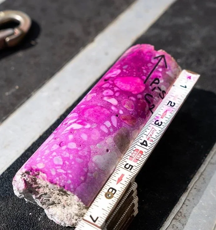To assess this, a pH-sensitive indicator solution is applied directly to the extracted core, allowing the carbonation depth to be visually identified on-site. Areas that turn pink indicate uncarbonated concrete with higher pH, while areas that remain colourless indicate carbonated concrete.