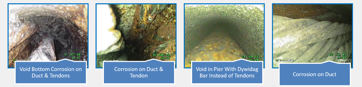 Borescope inspection provides direct visual documentation of grout conditions within the duct while minimizing physical disturbance to the PT system.